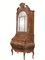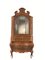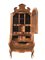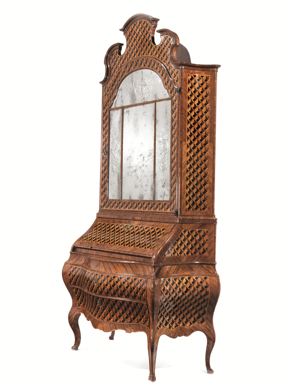 L’alzata presenta un’anta con specchio al mercurio inciso a motivi floreali, che segue le linee ondulate del mobile e termina con un cappello realizzato con legno di testa e spezzato in tre moduli curvilinei. Al suo interno nasconde due file di cassetti intervallati da un’anta centrale e piccoli vani a giorno, spesso destinati ad accogliere preziose porcellane.
