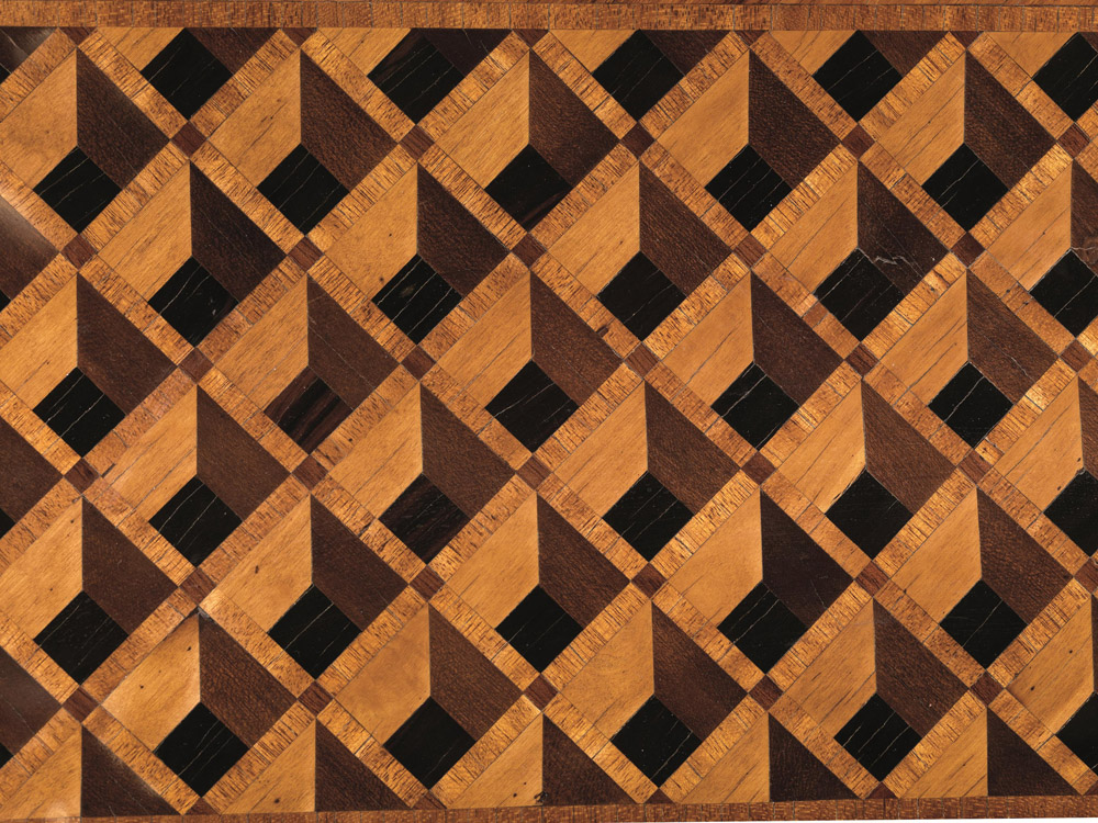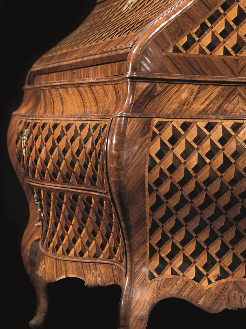 Il superbo intarsio e il contrasto dei materiali utilizzati regalano trame policrome con un incisivo effetto volumetrico, con risultati simili a quelli che troviamo sui mobili eseguiti da grandi ebanisti francesi come Jean-François Oeben, famoso per la sua maestria in questo tipo di intarsio.