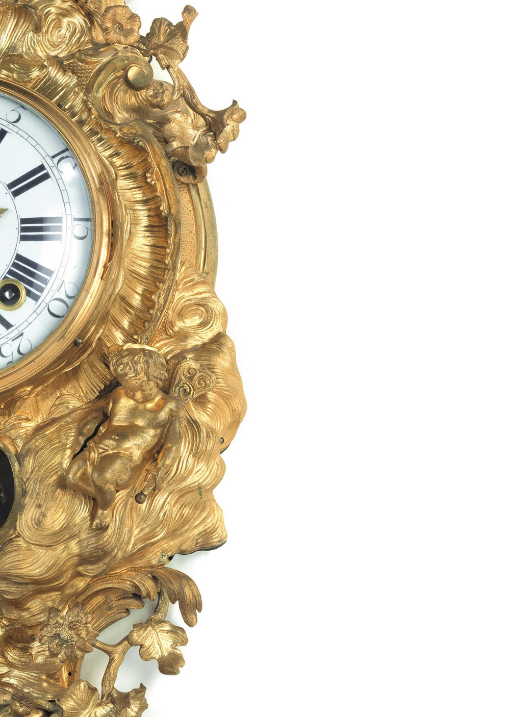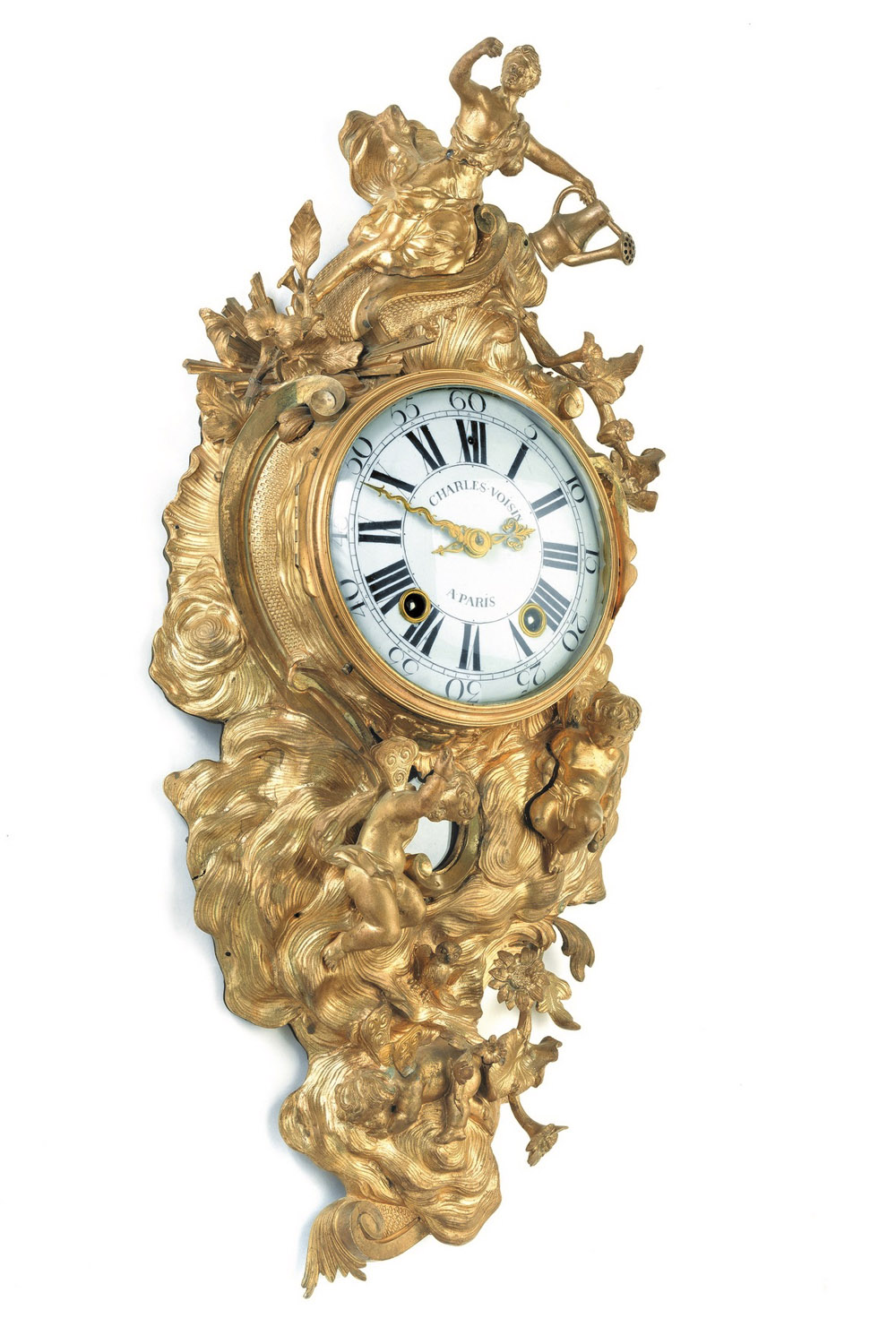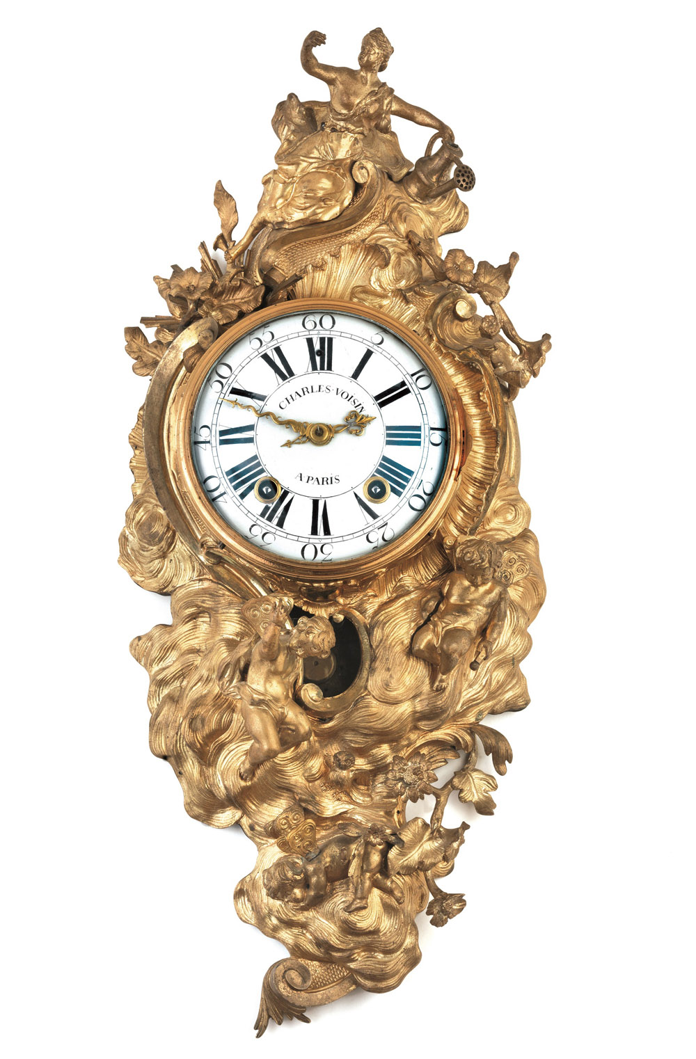 in chiselled gilt-bronze, richly embellished with a female figure at the top and winged putti among clouds at the bottom. It is marked with the “C” couronné poinçon , which testifies the execution to between 1745 and 1749, when the payment of a tax on bronze objects was introduced. White enamel dial with blue and black numerals, gilt-bronze hands, the dial and the movement signed Charles Voisin a Paris . Movement currently working with anchor escapement; the clock strikes the hours and half hours.
