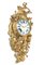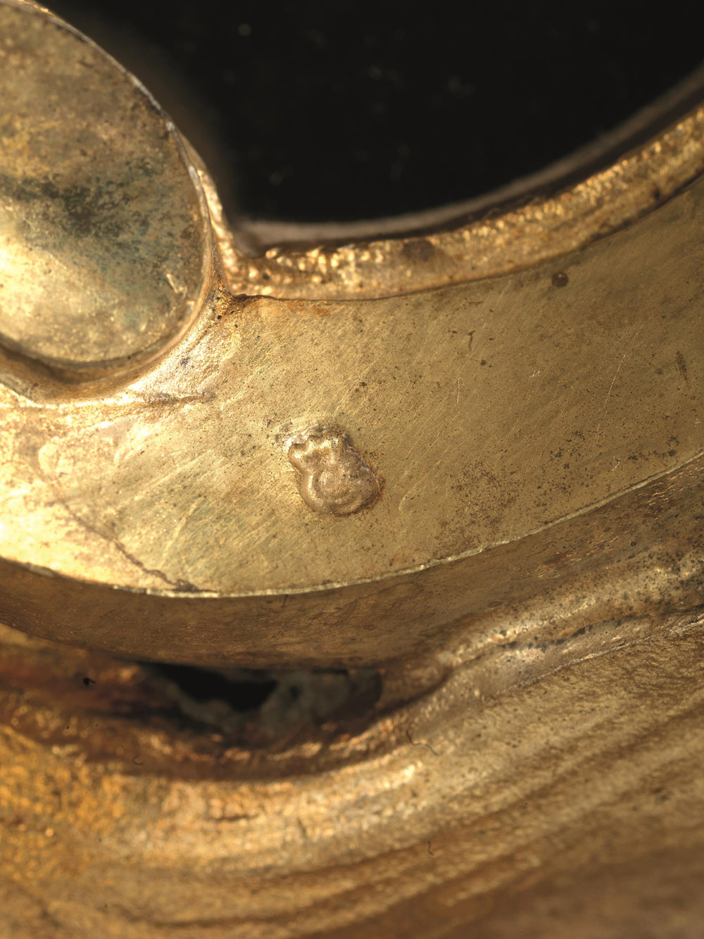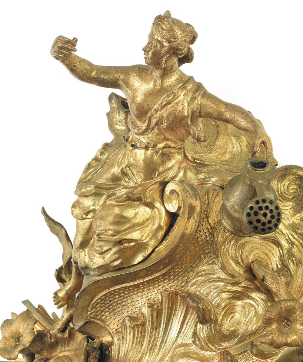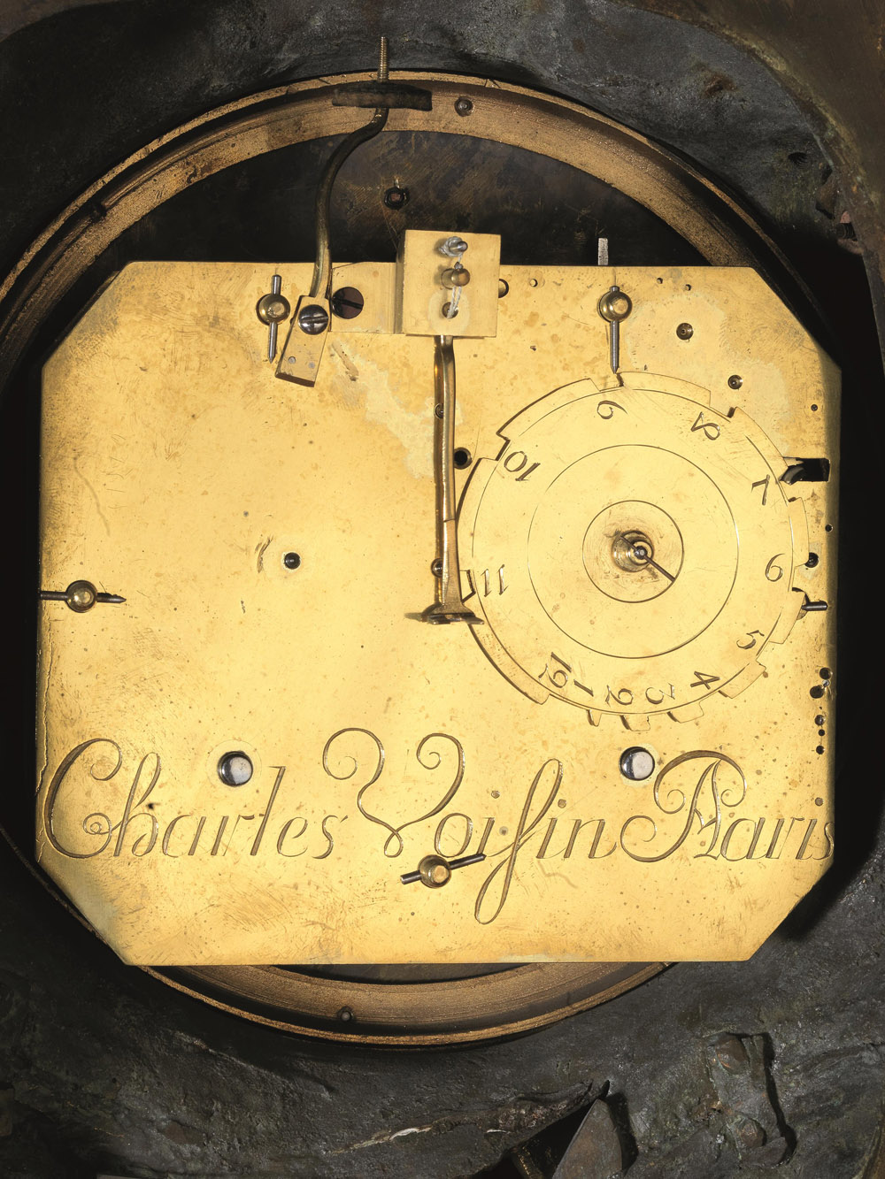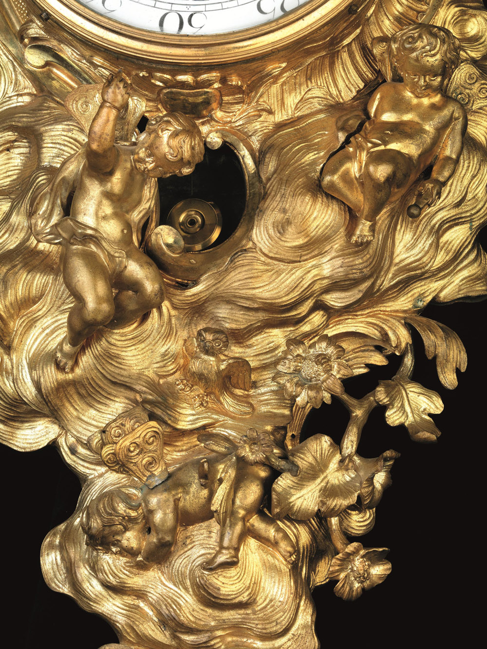 in chiselled gilt-bronze, richly embellished with a female figure at the top and winged putti among clouds at the bottom. It is marked with the “C” couronné poinçon , which testifies the execution to between 1745 and 1749, when the payment of a tax on bronze objects was introduced. White enamel dial with blue and black numerals, gilt-bronze hands, the dial and the movement signed Charles Voisin a Paris . Movement currently working with anchor escapement; the clock strikes the hours and half hours.