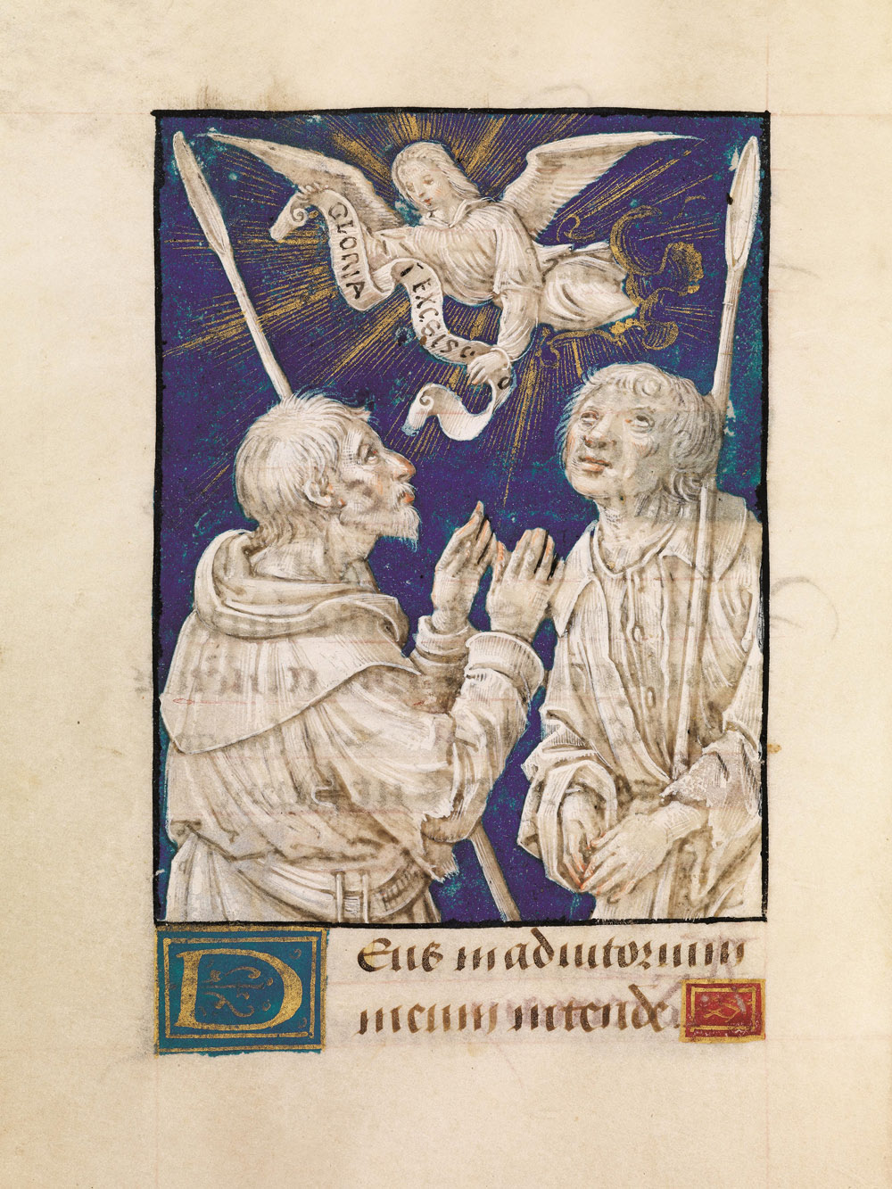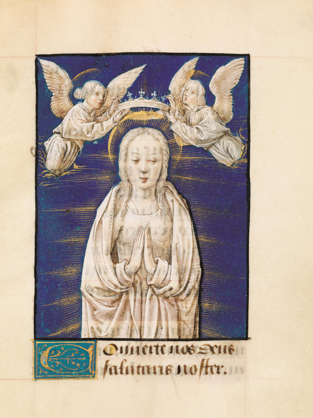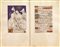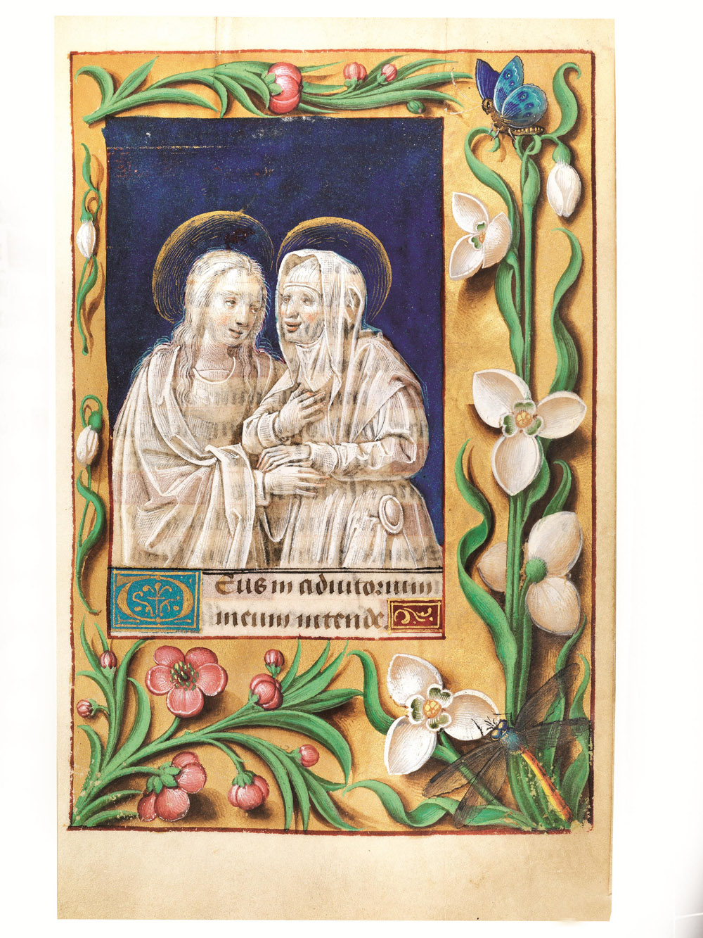 LIBRO D'ORE ALL'USO DI TOURS in latino e in francese Francia, Tours, c. 1500-1508 MANOSCRITTO MINIATO SU PERGAMENA, in 8vo (173 x 111 mm), [123] carte, numerate 1-247 da mano posteriore (ultima carta bianca). Completo. Specchio di scrittura 97 x 65 mm. BOOK OF HOURS, USE OF TOURS in Latin and French France, Tours, ca. 1500-1508 ILLUMINATED MANUSCRIPT ON VELLUM, 8vo (173 x 111), [123] leaves numbered 1-247 by a later hand (last leaf blank). Complete. Written-space 97 x 65 mm.Testo su una colonna di 16 righe, in caratteri gotici in inchiostro marrone scuro, con nomi delle sezioni e di alcuni santi nel Calendario in rosso. Numerose iniziali alte una o due linee filigranate in oro su fondo blu o rosso, numerose fasce decorative alte una linea filigranate in oro su fondo rosso. UNDICI GRANDI MINIATURE A PIENA PAGINA con le figure in colore neutro con fini ombreggiature e lumeggiature in bianco, e con dettagli della carnagione in rosa, su fondali blu, e con aureole e raggi di luce in oro, e TRE AMPIE BORDURE FLOREALI POLICROME (bianco, rosso, verde, blu, giallo, rosa e cremisi) su fondo oro, abitate da libellule, farfalle, bruchi, una mosca e una coccinella. Armi presumibilmente coeve miniate a colori alla carta 26v. (Nella miniatura dell’Annunciazione lo scritto al verso della carta si vede attraverso la pergamena, soprattutto in corrispondenza delle figure; questo accade, ma in modo meno evidente, in un paio di altre miniature; due bordure presentano piccole abrasioni agli angoli). Legatura francese di fine Ottocento firmata "Fauconnier" in marocchino rosso riccamente decorato in oro e con fermagli, sguardie marmorizzate, tagli dorati, segnacolo di seta. Custodia cartonata rivestita in tela. Il codice è staccato dalla legatura, che presenta un paio di trascurabili difetti all’interno ma, esternamente, è in ottime condizioni. INUSUALE E SQUISITO LIBRO D'ORE MINIATO NEL GUSTO DI JEAN BOURDICHON E DAL MAESTRO DI CLAUDIA DI FRANCIA PROVENIENZA: Il manoscritto è stato miniato a Tours e prodotto per l'uso di quella città, come dimostrano gli incipit delle varie sezioni dell'Ufficio della Vergine e dell'Ufficio dei Morti. Ad ulteriore conferma, il calendario segnala in rosso la traslazione delle spoglie di San Martino, vescovo di Tours, il 4 luglio e l'11 novembre, e le feste di San Gregorio di Tours (7 novembre) e di San Gaziano di Tours (18 dicembre), santi che sono nominati anche nelle Litanie. Stemma non identificato, presumibilmente coevo, miniato alla carta 26v, racchiuso entro ghirlanda di foglie decorata da nastri rossi.