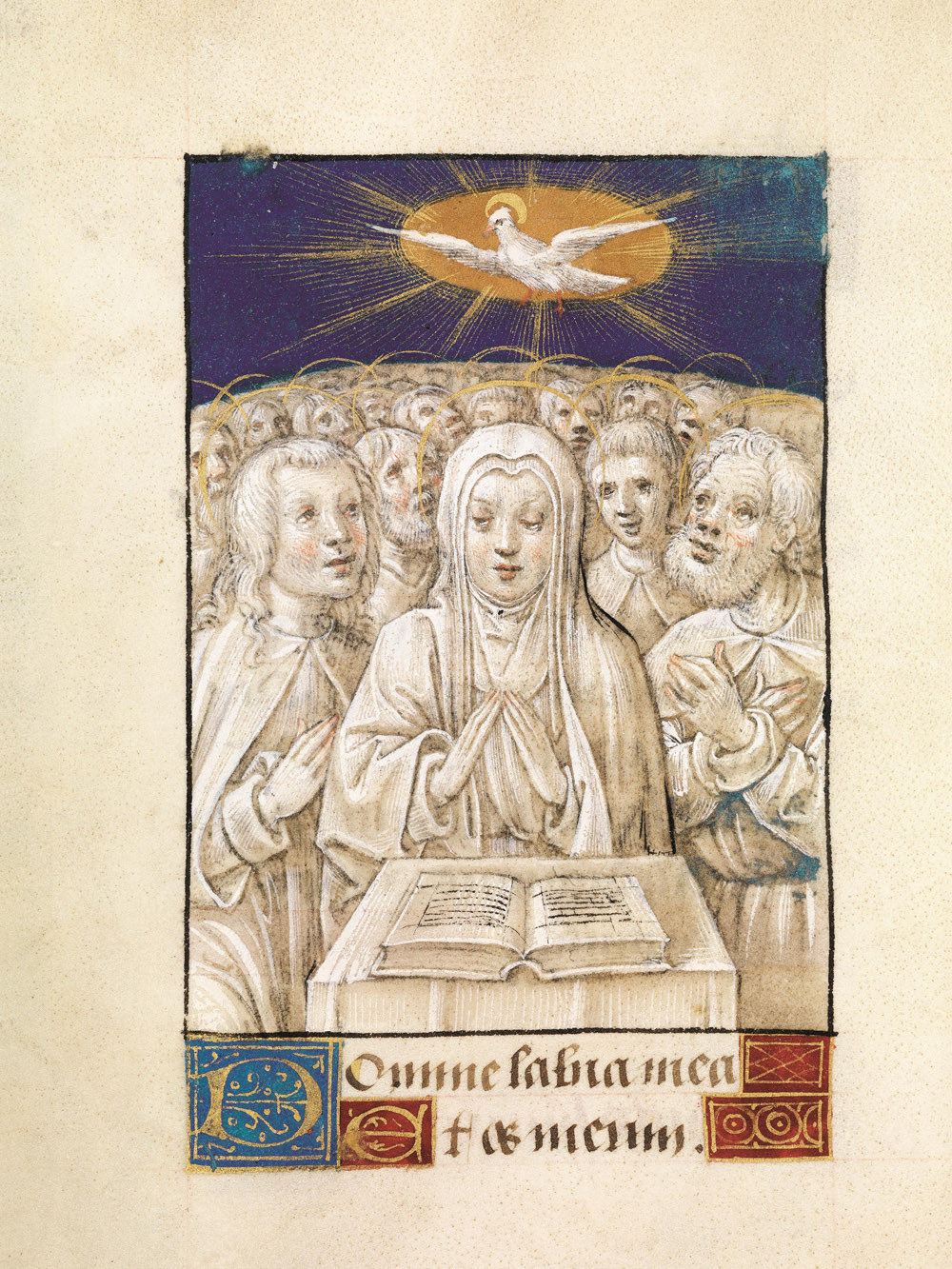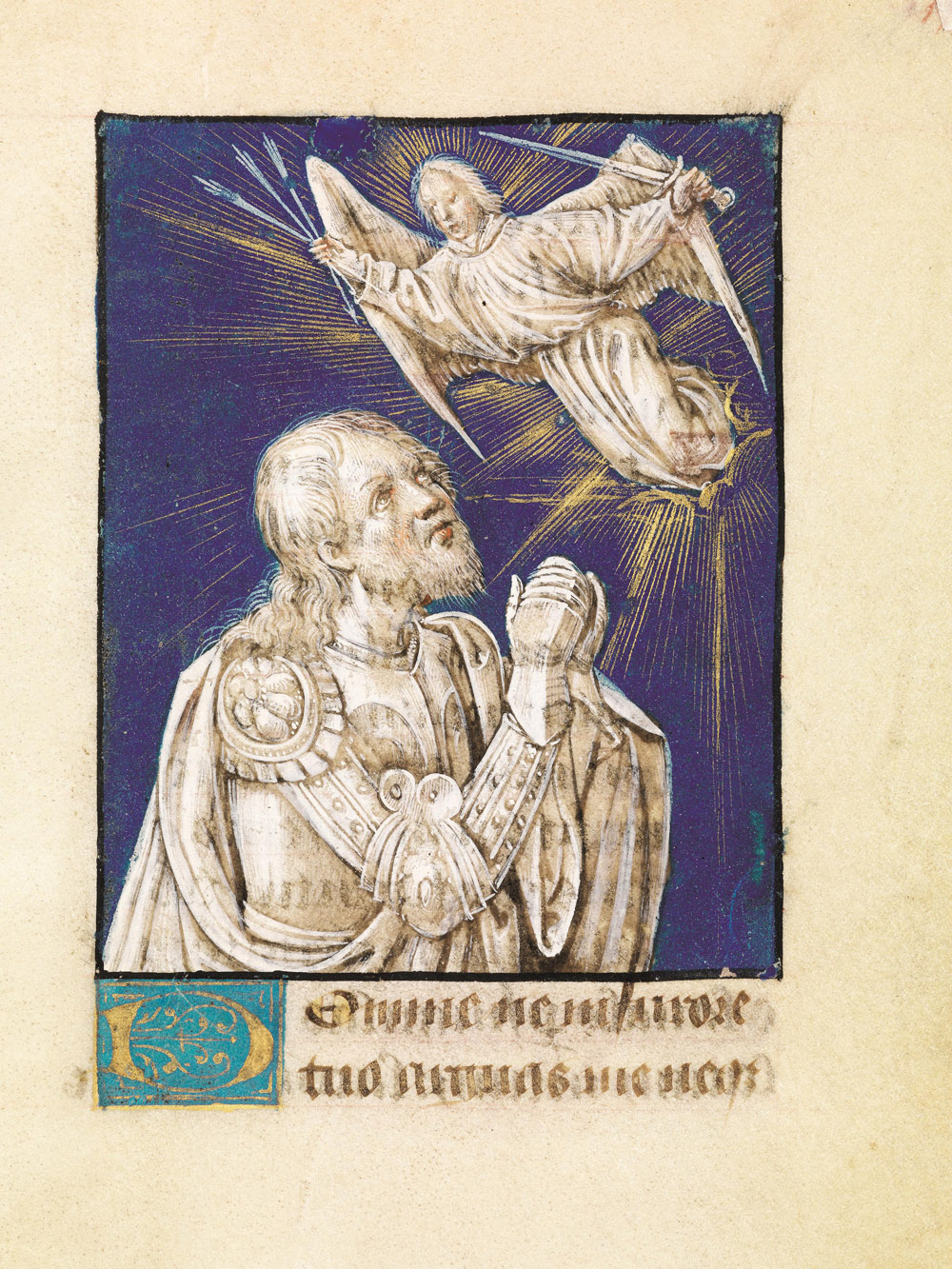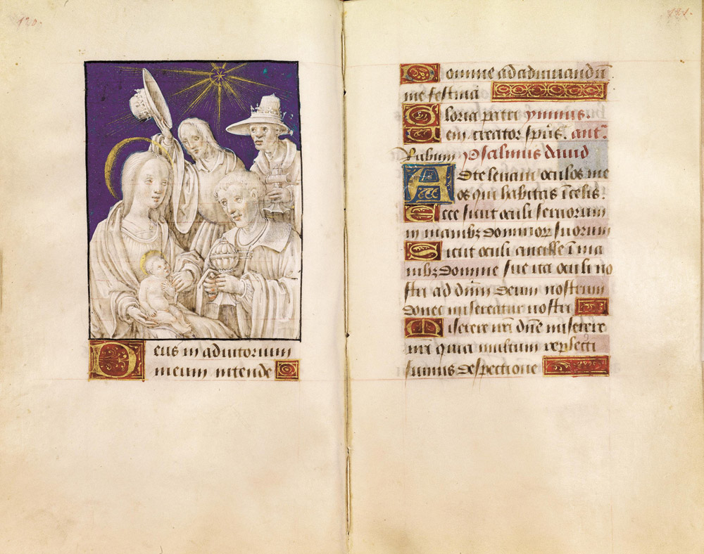 LIBRO D'ORE ALL'USO DI TOURS in latino e in francese Francia, Tours, c. 1500-1508 MANOSCRITTO MINIATO SU PERGAMENA, in 8vo (173 x 111 mm), [123] carte, numerate 1-247 da mano posteriore (ultima carta bianca). Completo. Specchio di scrittura 97 x 65 mm. BOOK OF HOURS, USE OF TOURS in Latin and French France, Tours, ca. 1500-1508 ILLUMINATED MANUSCRIPT ON VELLUM, 8vo (173 x 111), [123] leaves numbered 1-247 by a later hand (last leaf blank). Complete. Written-space 97 x 65 mm.Testo su una colonna di 16 righe, in caratteri gotici in inchiostro marrone scuro, con nomi delle sezioni e di alcuni santi nel Calendario in rosso. Numerose iniziali alte una o due linee filigranate in oro su fondo blu o rosso, numerose fasce decorative alte una linea filigranate in oro su fondo rosso. UNDICI GRANDI MINIATURE A PIENA PAGINA con le figure in colore neutro con fini ombreggiature e lumeggiature in bianco, e con dettagli della carnagione in rosa, su fondali blu, e con aureole e raggi di luce in oro, e TRE AMPIE BORDURE FLOREALI POLICROME (bianco, rosso, verde, blu, giallo, rosa e cremisi) su fondo oro, abitate da libellule, farfalle, bruchi, una mosca e una coccinella. Armi presumibilmente coeve miniate a colori alla carta 26v. (Nella miniatura dell’Annunciazione lo scritto al verso della carta si vede attraverso la pergamena, soprattutto in corrispondenza delle figure; questo accade, ma in modo meno evidente, in un paio di altre miniature; due bordure presentano piccole abrasioni agli angoli). Legatura francese di fine Ottocento firmata "Fauconnier" in marocchino rosso riccamente decorato in oro e con fermagli, sguardie marmorizzate, tagli dorati, segnacolo di seta. Custodia cartonata rivestita in tela. Il codice è staccato dalla legatura, che presenta un paio di trascurabili difetti all’interno ma, esternamente, è in ottime condizioni. INUSUALE E SQUISITO LIBRO D'ORE MINIATO NEL GUSTO DI JEAN BOURDICHON E DAL MAESTRO DI CLAUDIA DI FRANCIA PROVENIENZA: Il manoscritto è stato miniato a Tours e prodotto per l'uso di quella città, come dimostrano gli incipit delle varie sezioni dell'Ufficio della Vergine e dell'Ufficio dei Morti. Ad ulteriore conferma, il calendario segnala in rosso la traslazione delle spoglie di San Martino, vescovo di Tours, il 4 luglio e l'11 novembre, e le feste di San Gregorio di Tours (7 novembre) e di San Gaziano di Tours (18 dicembre), santi che sono nominati anche nelle Litanie. Stemma non identificato, presumibilmente coevo, miniato alla carta 26v, racchiuso entro ghirlanda di foglie decorata da nastri rossi.