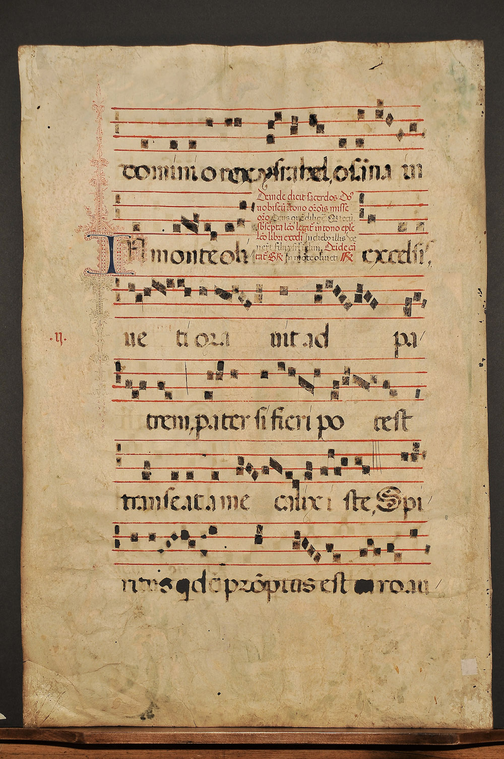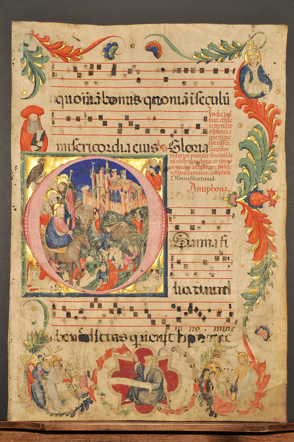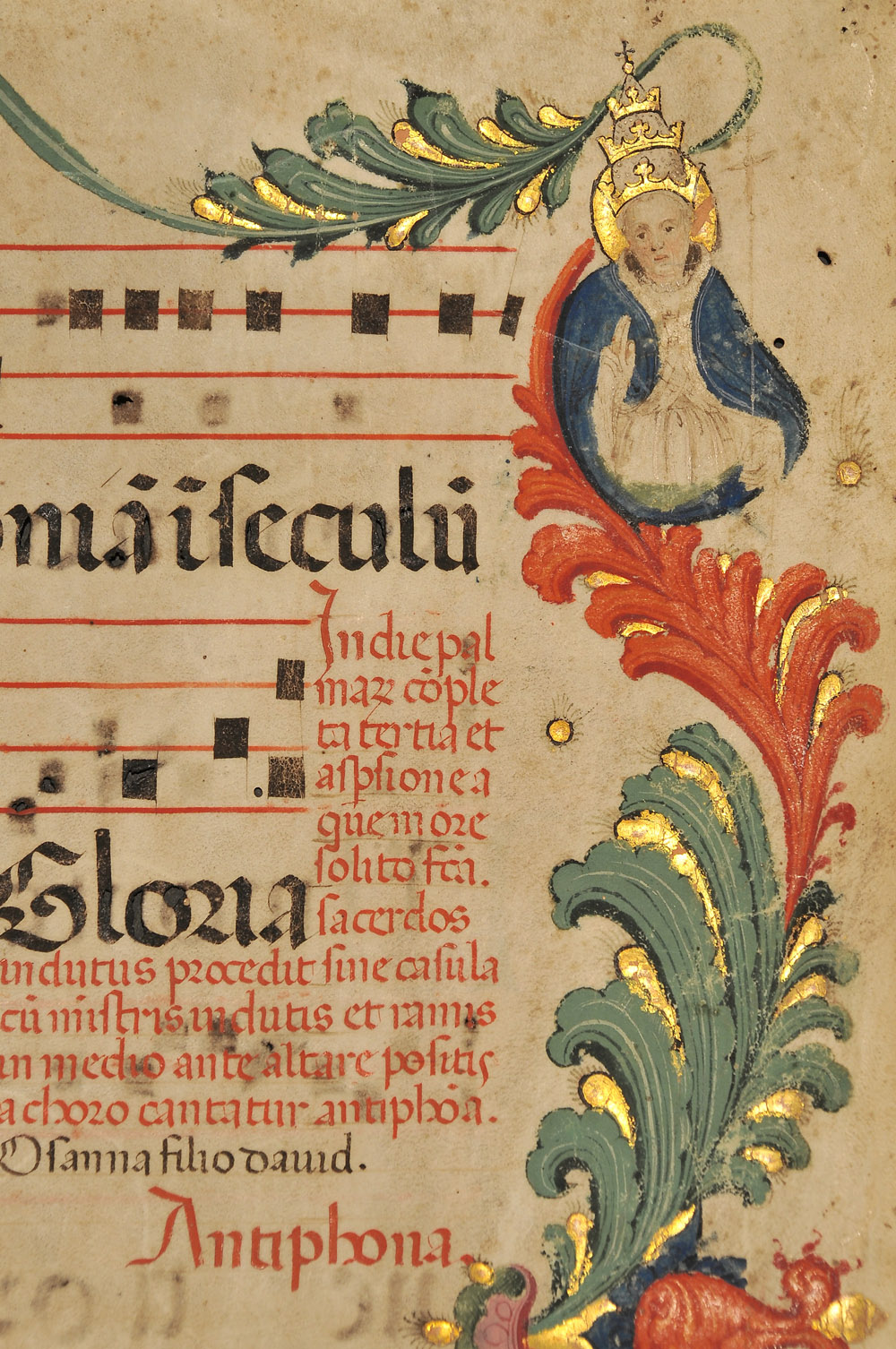 "Scrittura gotica rotonda, notazioni musicali su tetragramma. Iniziale "I" rubricata in colore blu con disegni a penna sul verso del foglio. Iniziale "O", "Osanna filio david benedictus qui venit in nomine", antifona della domenica delle Palme. Precede l’antifona rubricato: "In die palmarum completa tertia et aspersione ague more solito sancta. Sacerdos indutus procedit sine casula cum ministris indutis et ramis in medio ante altare positis a choro cantatur antiphona Osanna filio david". La rubrica descrive l'ingresso del sacerdote, secondo il rito liturgico della domenica delle Palme, con l'aspersione dell'acqua santa e la collocazione dei rami di palma sull'altare, mentre viene intonato il canto dell'Osanna. (Qualche foro causato dall'inchiostro, abrasioni alla parte inferiore del foglio).