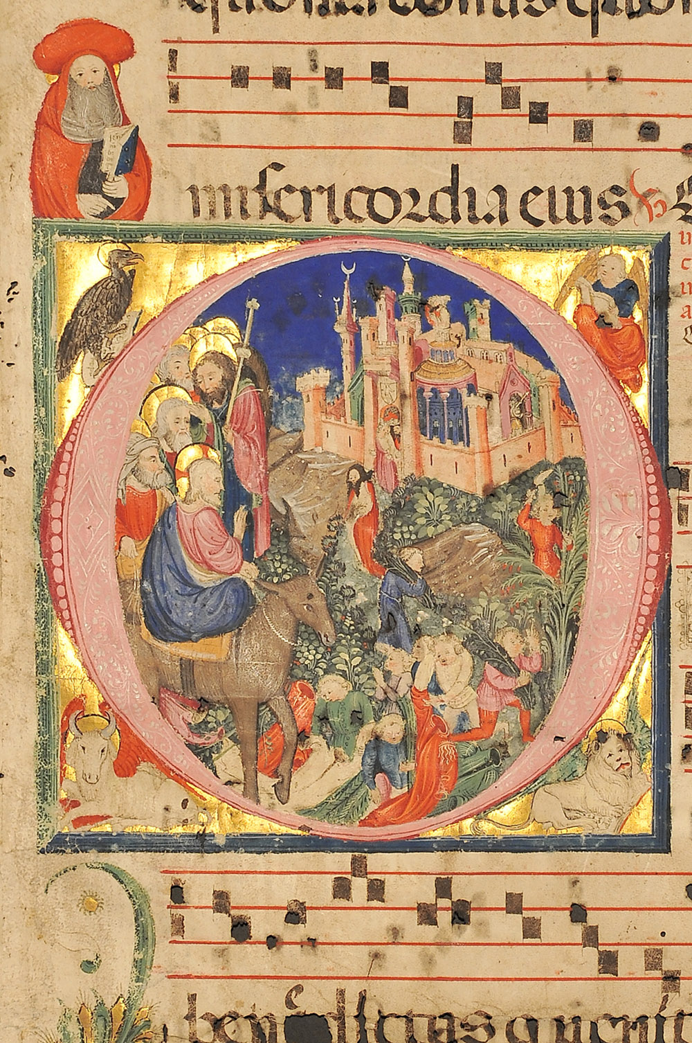 Al centro è rappresentato entro un compasso polilobato il profeta Isaia con un lungo cartiglio, mentre indica con la destra l'episodio rappresentato nell’iniziale con l' Entrata di Cristo in Gerusalemme . Cristo benedicente e accompagnato dai suoi discepoli avanza verso Gerusalemme accolto da una folla festante che al suo passaggio stende a terra le vesti, mentre un poco distante tre giovani stanno tagliando dei rami di palma. La città santa di Gerusalemme è rappresentata in lontananza, chiusa nel perimetro delle sue mura con torri quadrangolari. Il simbolo della mezzaluna, visibilmente ripetuto sulle torri più alte, le identifica come città non più cristiana. Tra gli edifici facilmente riconoscibile è la struttura a pianta centrale del Santo Sepolcro sulla cui sommità sono rappresentati due personaggi inturbantati. Sullo sfondo dorato, che riquadra l'iniziale, sono dipinti i simboli dei quattro Evangelisti, mentre al di sopra della lettera S. Gerolamo, rappresentato con il galero cardinalizio, ripete lo stesso gesto di Isaia, indicando l'episodio narrato nella lettera iniziale. A sinistra e a destra nel margine inferiore del foglio sono rappresentati due episodi della Passione. Nella Salita al Calvario , Gesù, sostenuto da Maria e Giovanni e dalle Pie Donne, è trascinato da alcuni soldati, uno di questi lo percuote sul capo. Gesù porta la croce sulla quale sono già conficcati i chiodi, un particolare iconografico non molto frequente. A destra Cristo risorto appare alla Maddalena . Quest'ultimo episodio sintetizza due momenti diversi: l'apparizione di Gesù alla Maddalena, noto come Noli me tangere , e l'apparizione di Cristo ai suoi e alla madre dopo la resurrezione. Accanto alla Maddalena e alle Pie Donne si scorge la figura inginocchiata di un frate che dall'abito potrebbe appartenere all’ordine domenicano. La sua presenza ci permette di ipotizzare una possibile originale destinazione del codice ad un convento dell'ordine. La decorazione a foglie di acanto continua nel margine destro del foglio fino ad incorniciare in alto la figura a mezzo busto benedicente di un Santo pontefice.