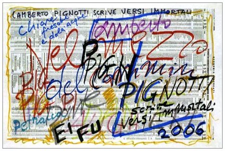 LAMBERTO PIGNOTTI 1926 Senza titolo 2006 T.m. su carta di giornale 31,5 x 47. Firma in a. a s., data in b. a d. Autentica dell'autore su foto. Pubbl.: "Lamberto Pignotti - la poesia ve lo dice prima la poesia ve lo dice meglio - Opere dal 1945 al 2010" cat. mostra Fondazione Berardelli, Brescia, 2010, p.185.