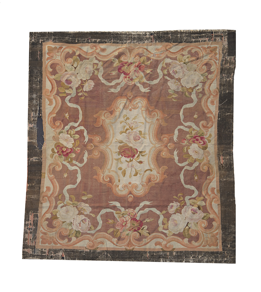 Tappeto Aubusson, Francia fine sec. XIX, disegno a medaglione con mazzi di rose su fondo bordeaux (cm 262x235) (gravi difetti)