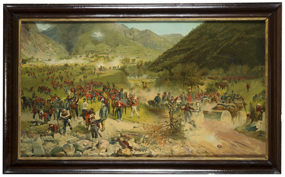 Oleografia intelata da Felice Zennaro "Battaglia di Bezzecca" (cm 57x100) In...