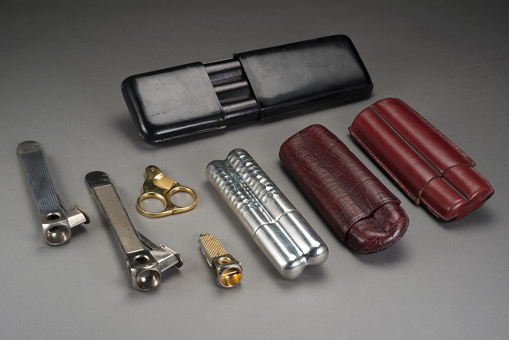 Lotto composto da quattro tagliasigari e quattro custodie per sigari in materiali diversi