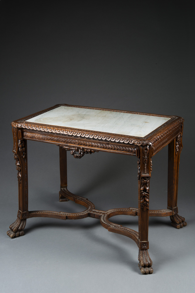 Tavolino da salotto di forma rettangolare con profili intagliati e decorati a motivi vegetali e stilizzati, gambe riunite da travertsa terminante a piedi ferini. Piano in marmo. Inizio sec. XX (cm 82x65x55)