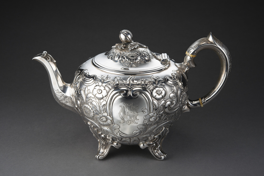 Caffettiera di forma bombata con corpo sbalzato a fiori e volute fogliate , presa del coperchio con frutto a tutto tondo . Cifrata 'CEM' , punzoni di Londra... (gr. 750) (lievi difetti)