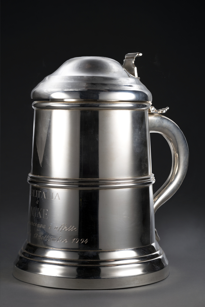 Porta ghiaccio a forma di boccale da birra in argento a corpo liscio iscritto "Pubblitalia Mike con riconoscenza ed affetto Montecarlo 1984". Titolo '800 , argentiere Faraone (gr lordi 2000)