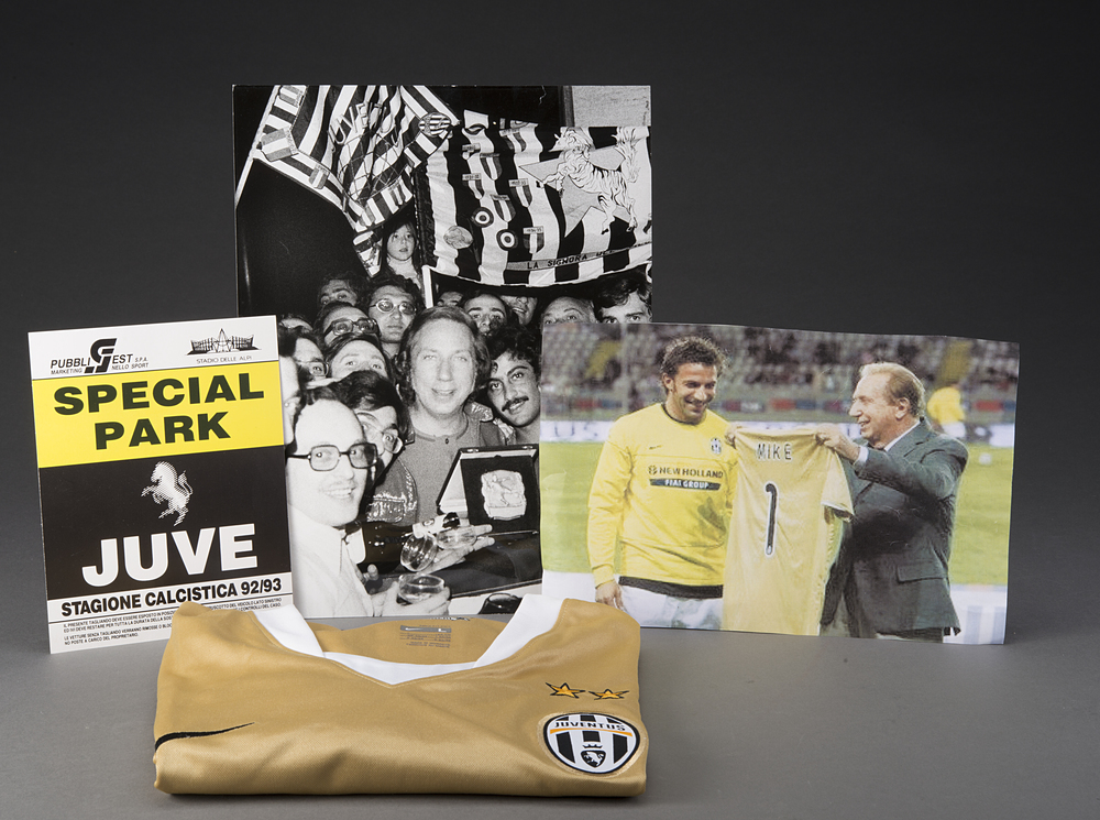 Lotto composto da una maglia da calcio color oro con al retro scritto MIKE ed il numero 1, corredata da foto di Mike Bongiorno mentre riceve la maglia da Alex Del Piero ed una foto in bianco e nero tra tifosi Juventini.