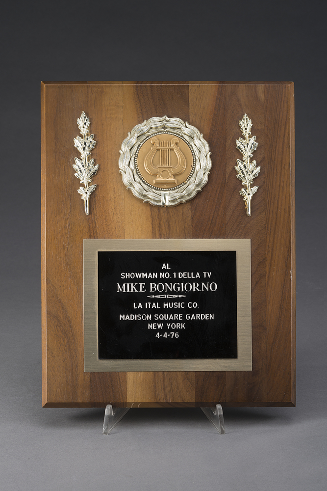 Targa Celebrativa allo Show man Nᄚ 1 della TV Mike Bongiorno, Ital Music Co. Madison Square Garden New York 1976.