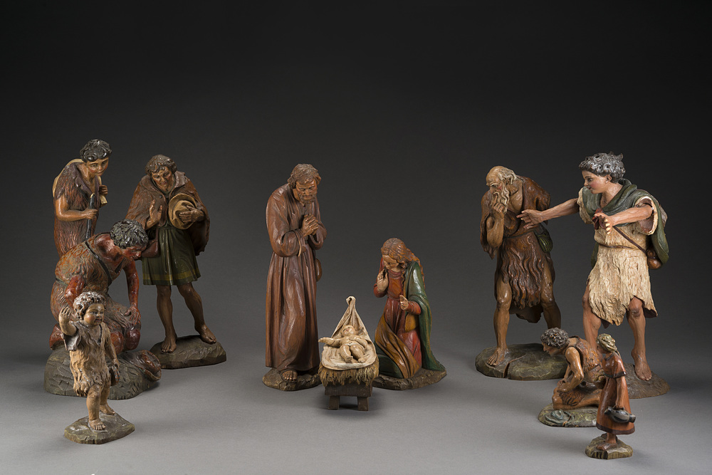 Manifatture diverse , presepe di Mike da bambino composto da undici figure in legno scolpito e laccato di diverse misure