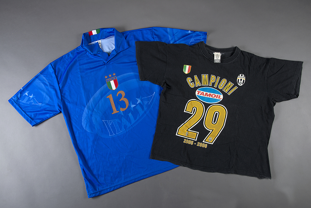 Lotto composto da una maglia della nazionale italiana non ufficiale a Mike Bongiorno ed una maglia dello Juventus Football Club Campioni 2005-2006