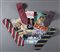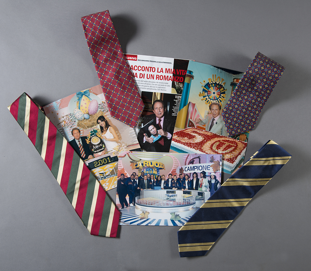 Lotto di quattro cravatte Marinella di diversi colori di cui due a motivi floreali e due a righe corredate da fotografie della trasmissione tv "La ruota della fortuna" e una indossata durante la presentazione del libro autobiografico