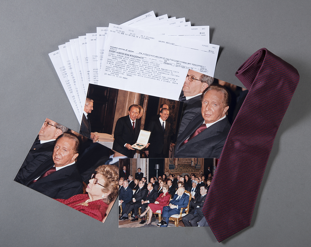 Cravatta Bardelli indossata da Mike mentre veniva insignito dal Presidente della Repubblica Carlo Azelio Ciampi della carica di Grande Ufficiale dell'Ordine al merito della Repubblica Italiana. Corredato da foto ricordo