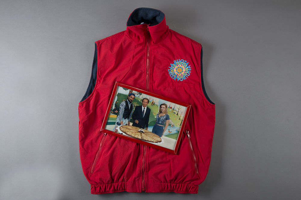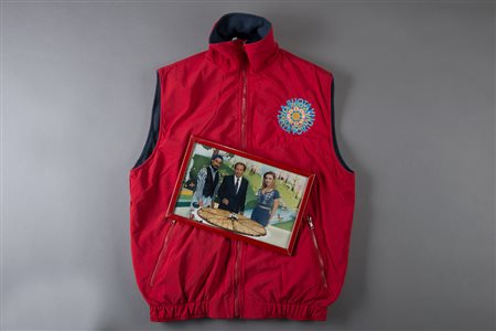 Lotto composto da un gilet imbottito color rosso con logo "La Ruota della Fortuna" ed una foto nello studio televisivo con Mike e Paola Barale. In cornice.