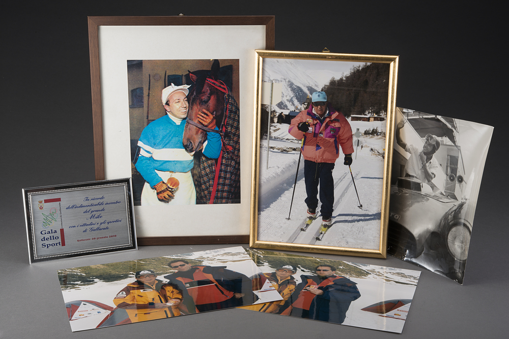 Lotto composto da quattro fotografie di Mike Bongiorno a colori ed in bianco e nero in vari momenti di vita sportiva di cui due in cornice ed una targa commemorativa del Gal� dello Sport a Mike Bongiorno