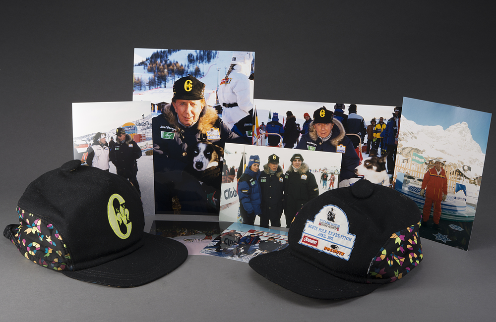 Lotto composto da due cappelli sportivi invernali di cui uno con due fotografie mentre viene indossato da Mike ed una fotografia di Mike alla Ruota della Fortuna a Cervinia