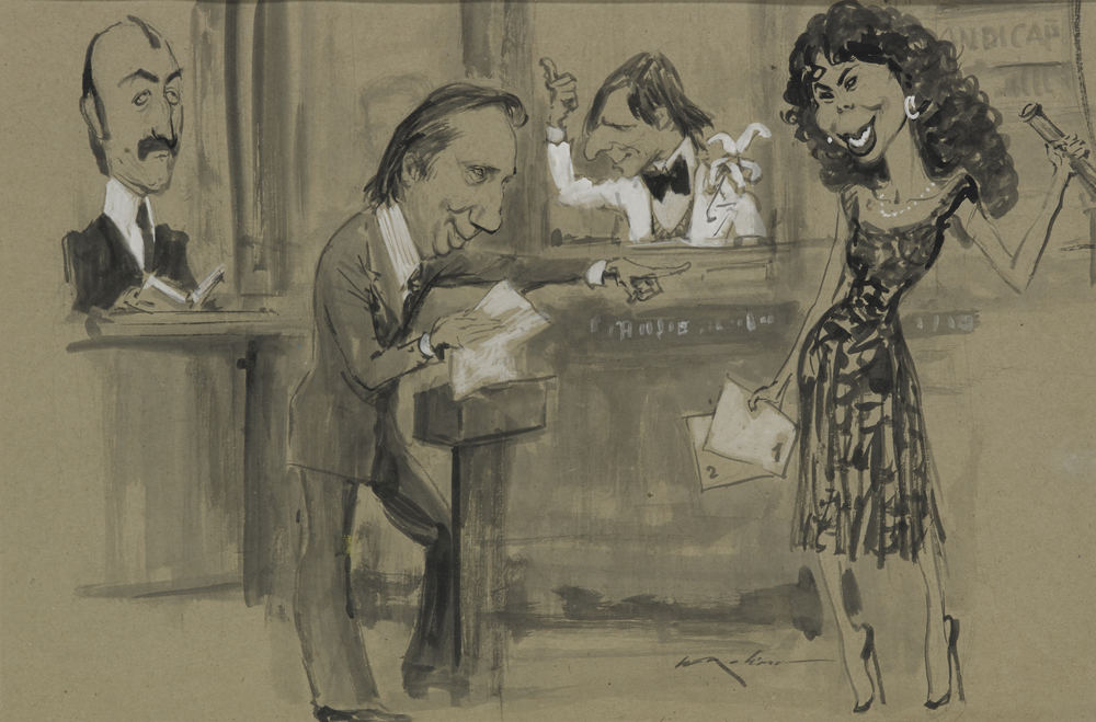 Caricatura di Mike Bongiorno e Sabina Ciuffini negli studi di Rischia tutto disegno su carta, firmato in basso a destra(cm 31,5x47)In cornice