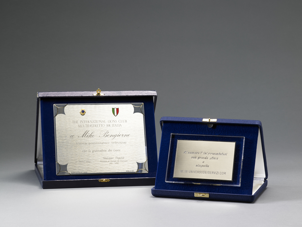 Lotto composto da due targhe celbrative: "Al numero uno dei presentatori" in argento e plexiglass ed una "A Mike Bongiorno mitico presentatore televisivo" The International Lions Club (In custodie)