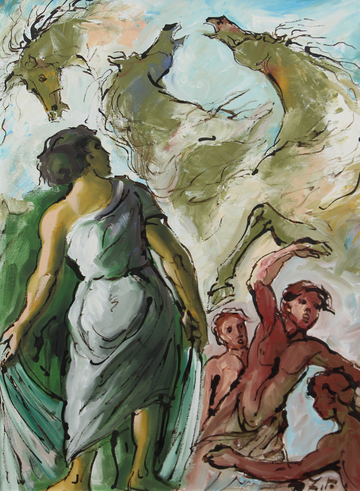 Rodolfo Zito, Cavalli e Figure, olio su tela, cm. 70x50, firmato in basso a destra, firmato e intitolato al retro