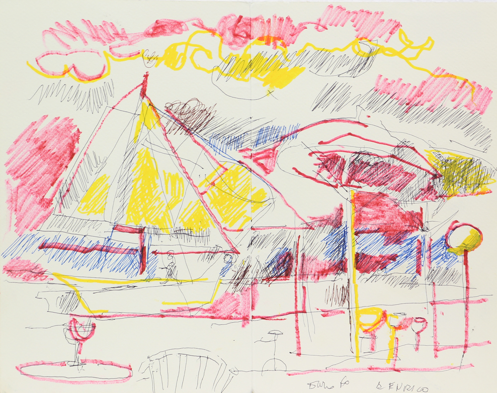 Dario Fo, Senza titolo, tecnica mista sul retro di un menù, cm. 30x37,5, firmata e dedicata in basso a destra, senza cornice