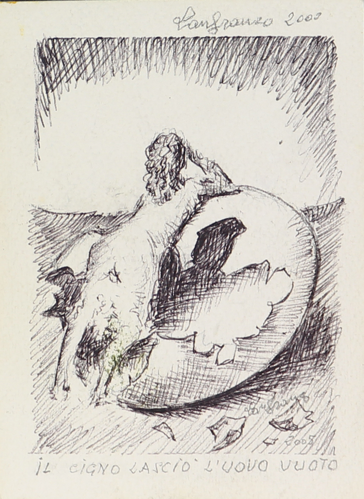 Lanfranco, Il Cigno Lasciò l'Uovo Vuoto, 2000, biro su cartoncino, cm. 15x10,5, firmato e datato in alto e in basso a destra, intitolata in basso, al retro à presente un altro disegno firmato e datato 2014, l'opera à accompagnata dal certificato di provenienza, senza cornice