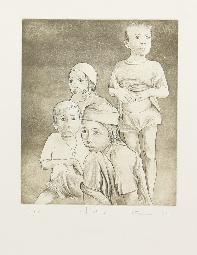 Ignoto, L'Attesa, 1972, incisione su carta, cm. 70x50 (lastra cm. 29,5x24,5), es. 4/10, firma non decifrata e data in basso a destra, intitolata in basso al centro, l'opera presenta segni di piegature, strappi ai margini e tracce di sporco al margine in alto, senza cornice