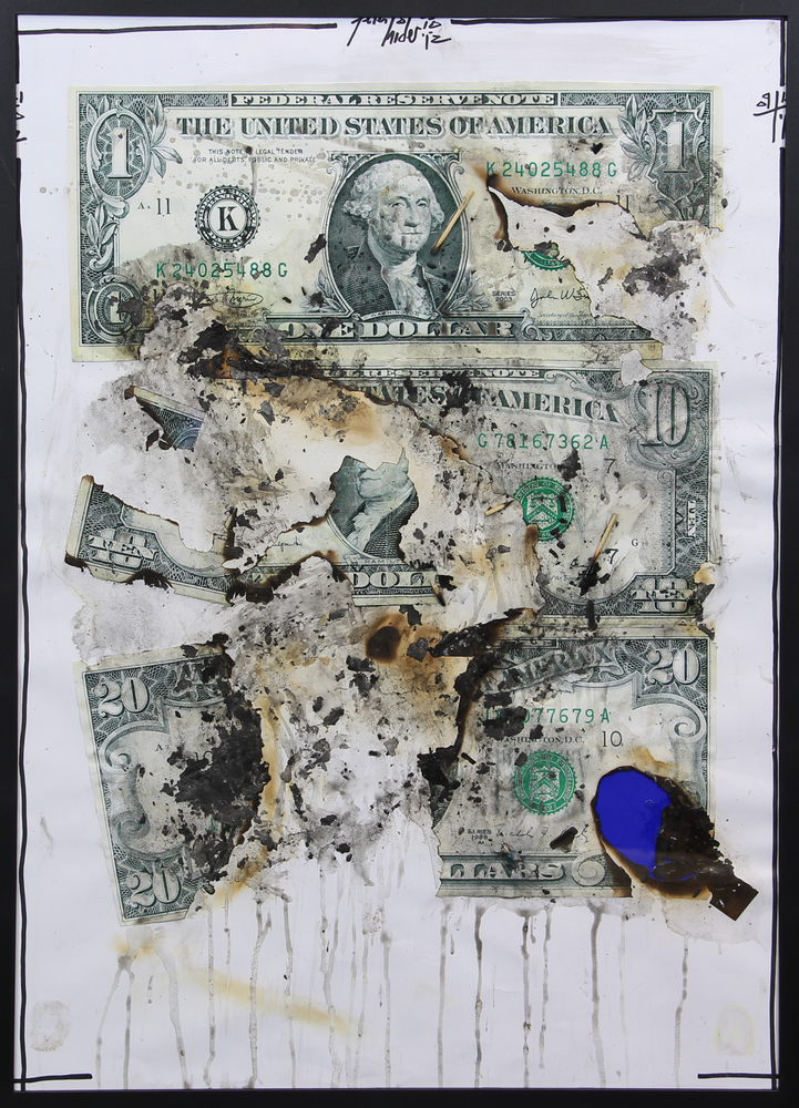 Peter Hide, Negazione (Denial), 2012, tecnica mista su cartoncino Fabriano con bruciature e inserti di tela blu, cm. 70x50, firmata in alto al centro, datata in alto a destra e sinistra, certificato di autenticità dell'artista su fotografia
