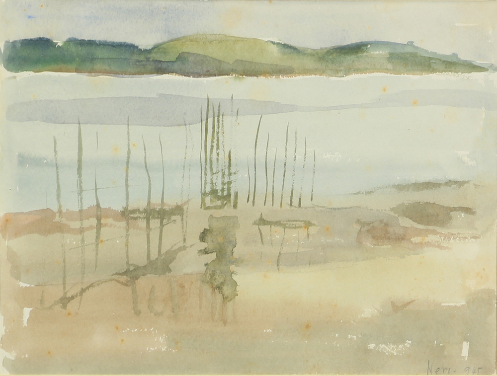 Ignoto, Paesaggio Lacustre, 1945, acquerello su carta, cm. 17,5x23,5, firmato "Neri" e datato in basso a destra