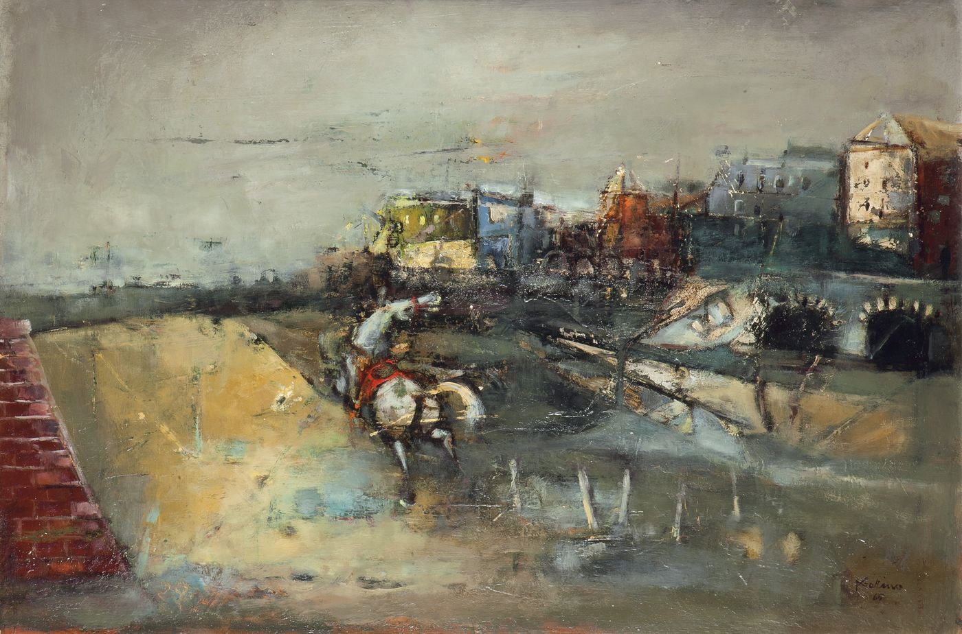 GARINO PIERO (Leinì (TO) 1922 - 2009 Torino) - "Paesaggio in grigio" 1965, 55x80 olio su tavola. Opera firmata e datata in basso a destra e al retro col titolo