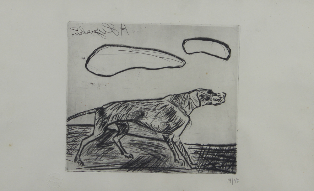 Antonio Ligabue, Cane e nubi, 1966, puntasecca su carta, cm. 37,5x57,5 (lastra cm. 23x26,5), es. 19/47, firmato in lastra in alto a sinistra, timbro a secco della Galleria d'Arte Negri di Guastalla in basso a destra, etichetta per autenticità e timbri della galleria Il Castello di Adria ed etichetta ed autentica della Galleria d'Arte Negri di Guastalla con timbro e firma al retro