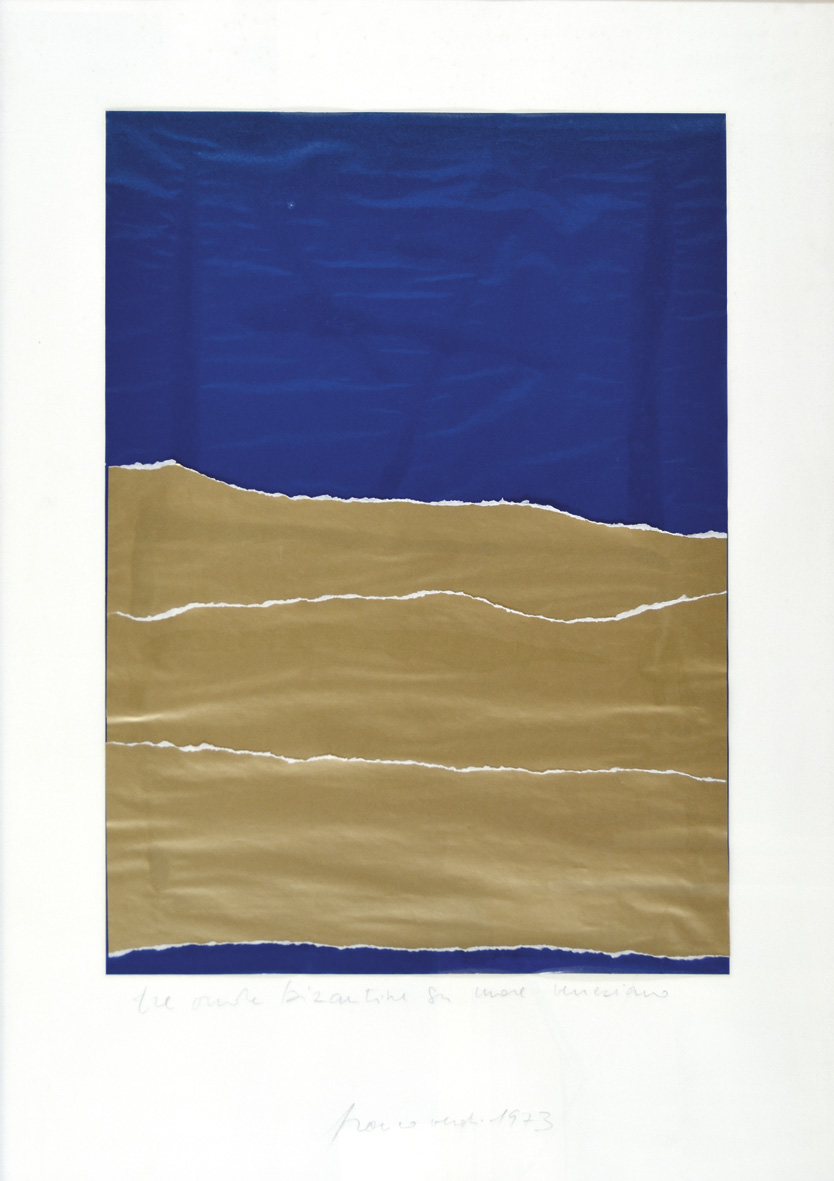 VERDI FRANCO Venezia 1934 - 2009 Tre onde bizantine su mare veneziano 1973 collage su carta 100x70 firma data e titolo in basso e al retro Galleria Peccolo Livorno; Galleria Santi Urbino; Rotonda di via Besana Milano