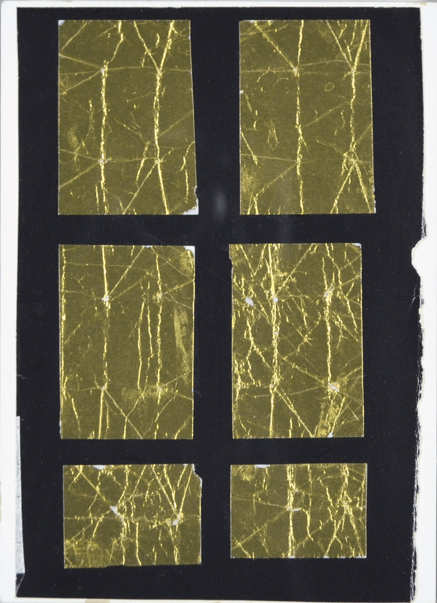 BIANCO REMO Milano 1922 - 1988 Tableau dorè 1980 tecnica mista e collage di foglia d'oro su cartoncino 17,5x12 firma e data al retro Autentica della sorella Lyda Bianchi su foto Eraldo di Vita Mail Art Milano - timbro al retro; certificato di Daniele Squaglia Lucca