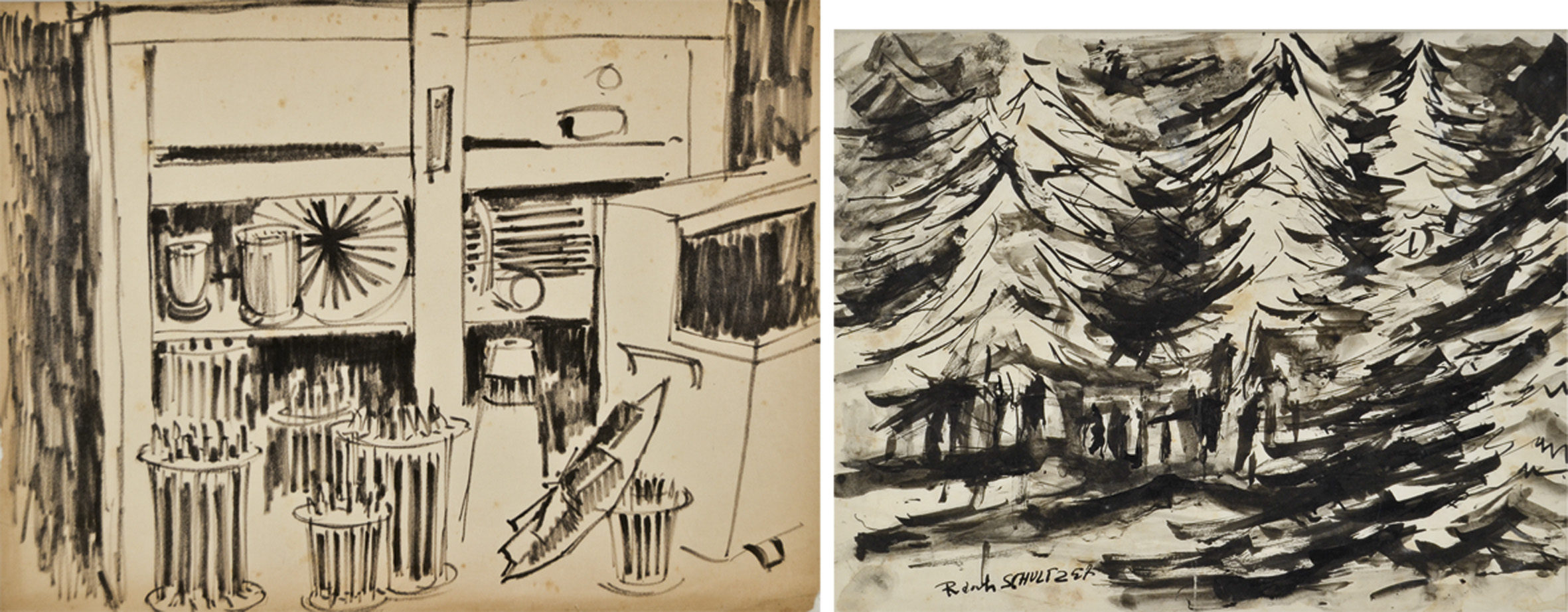 SCHULTZ RAOUL Isola Lero (Grecia) 1931 - Venezia 1971 Soggetti vari lotto di 2 tecniche miste su carta 30x40 - 22x28 senza titolo, la carta presenta lievi difetti Paesaggio 1957, firma e data in basso a destra