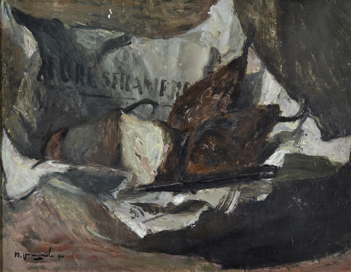 VARAGNOLO MARIO Venezia 1901 - 1971 Pere cotte 1941 olio su tavola 23x29 firma e data in basso a sinistra firma data e titolo al retro