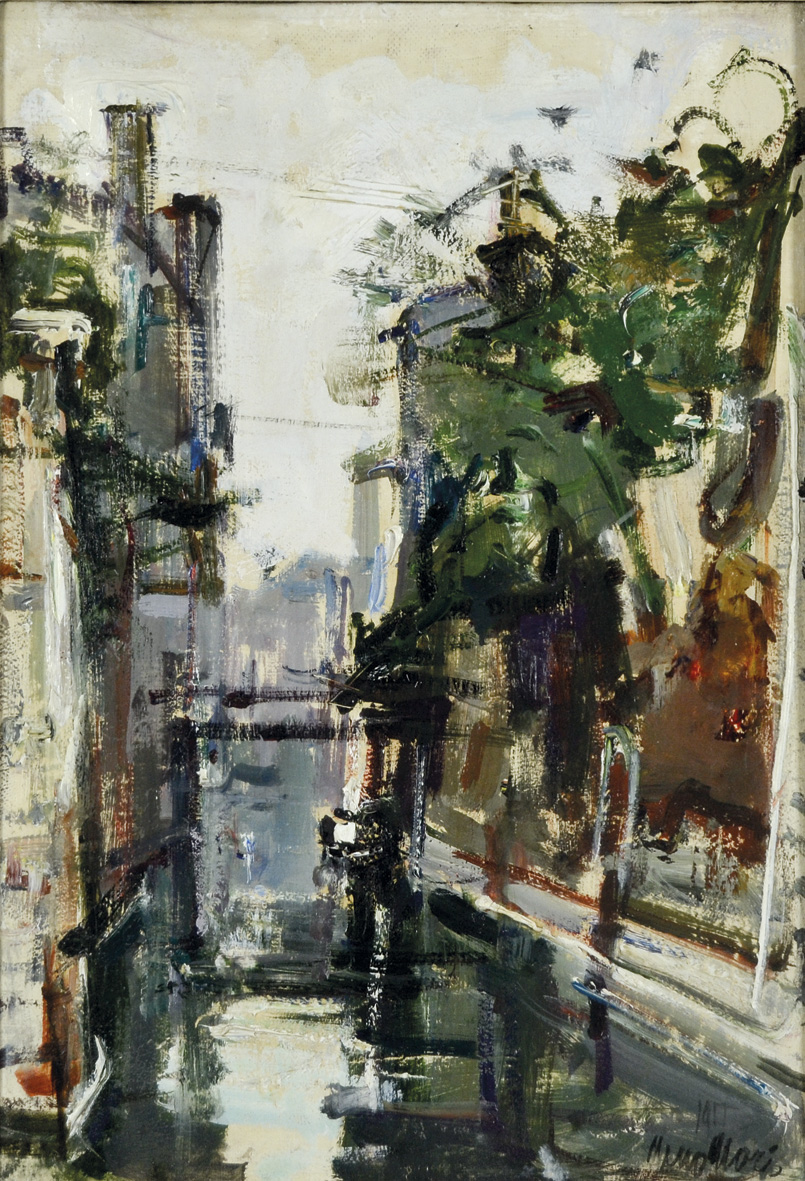 MORI NENO Venezia 1899 - 1968 Rio S. Caterina 1955 olio su tela 50x35 firma e data in basso a destra, titolo su etichetta dell'Autore al retro