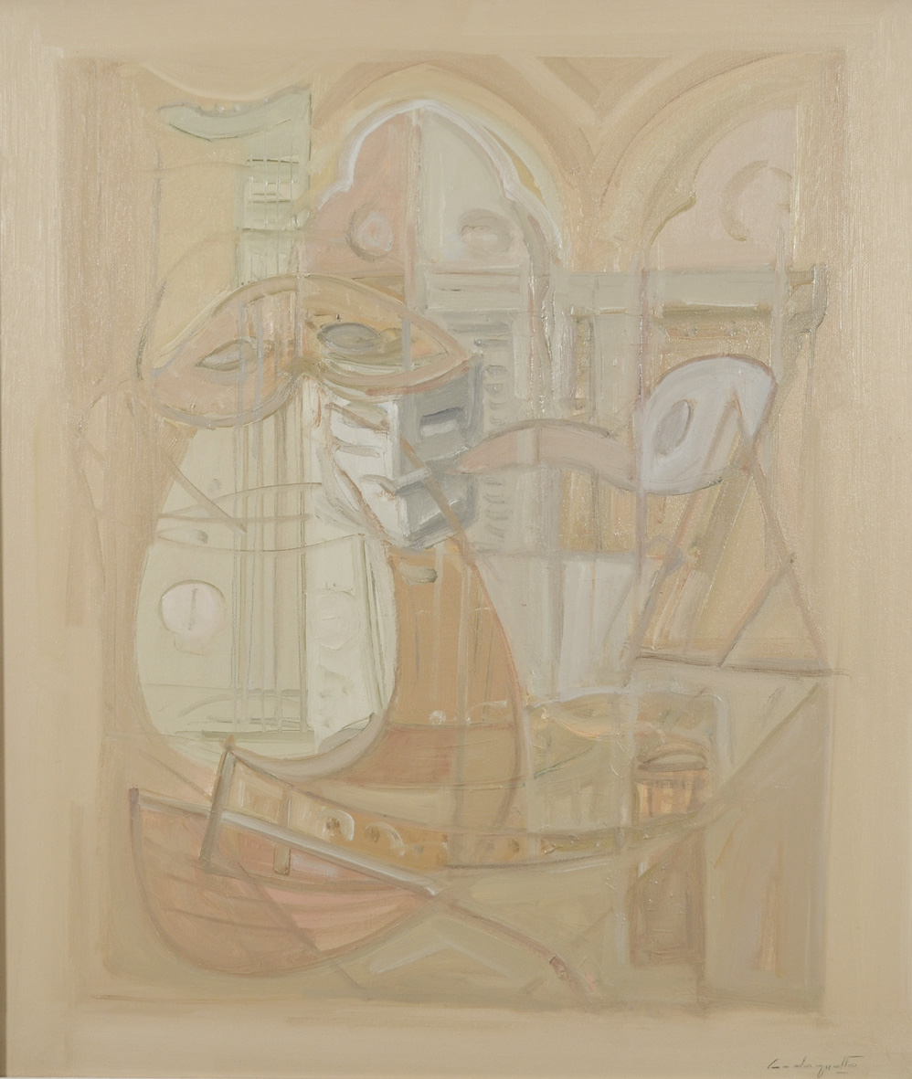 CODOGNOTTO RENZO Cesarolo (Ve) 1938 Composizione con maschere veneziane e strumenti musicali olio su tela 70x60 firma in basso a destra firma e titolo al retro