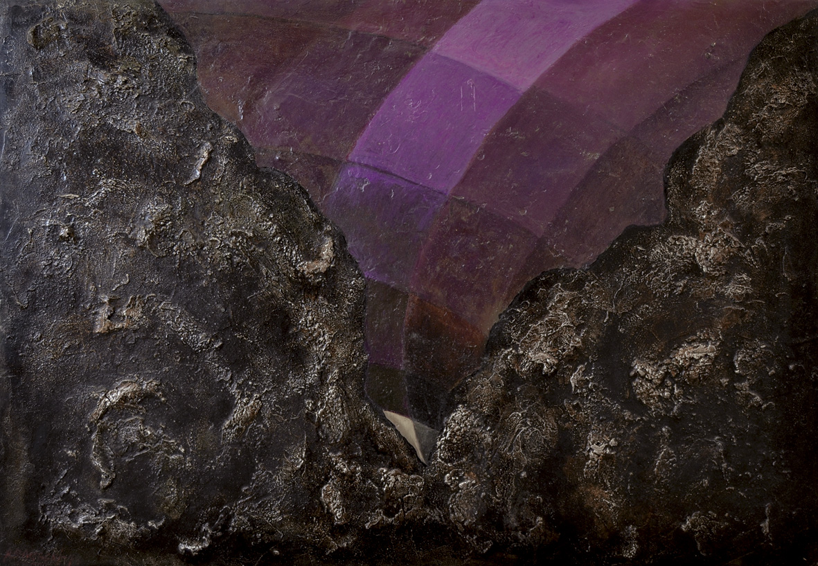 RACCAGNI ANDREA Imola 1921 - 2005 Opposizione tra razionale e irrazionale 1973 olio e tecnica mista su tavola 68x98 firma e data in basso a sinistra firma data e titolo al retro Bibliografia: "Andrea Raccagni" Testimone solitario di una energia cosmica a cura di Giovanni Granzotto e Franco Solmi ed. Fidesarte Mestre 2002 pag. 89
