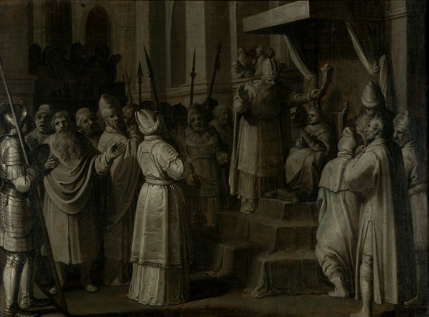 ATELIER DI AMBROSIUS FRANCKEN II (Anversa 1590 circa - 1632) - "L'incoronazione di Davide", 41,5x56,5 grisaille a olio su tela. Il fine e delicato dipinto raffigura un episodio della vita di Davide Re e Profeta: quello della sua consacrazione secondo quanto è descritto nella Bibbia (Samuel, 16). La Bibbia narra che a Samuele fu ordinato da Dio di riempire il corno di olio profumato e di andare a Betlemme da Jesse a consacrare un re. Samuele ubbidì e, giunto sul posto, vi consacrò il piccolo Davide, profetizzato re di Israele, che, ancora fanciullo, pascolava le pecore. Nel dipinto si vede proprio Samuele che versa l'olio consacrato dal corno sul capo di Davide bambino, raffigurato con la corona e vesti regali, sotto un baldacchino; tutt'intorno i parenti e gli abitanti di Betlemme che osservano. L'opera è attribuibile all'ambito di Ambrosius Francken II, pittore di notevole qualità appartenente ad una diramata famiglia di artisti. Nel 1623 Francken era associato come libero maestro alla Gilda di Anversa ed aveva un'avviata bottega con molti allievi. Il pittore, specializzato in piccole scene di soggetto religioso e scene di genere, dipinse spesso delle grisaille. La tela può essere utilmente confrontata con la scena, a monocromo, del Cristo con l'adultera del Museo Civico di Soisson: molto vicini lo stile, la pennellata, la tecnica di impaginazione della scena. Il dipinto è in ottime condizioni di conservazione (Dott. Prof. Arabella Cifani). Bibl.: - J. de Maere & M. Wabbes, Illustrated dictionary of 17th century Flemish painters, Bruxelles, 1994, ad vocem, ivi ulteriore bibliografia