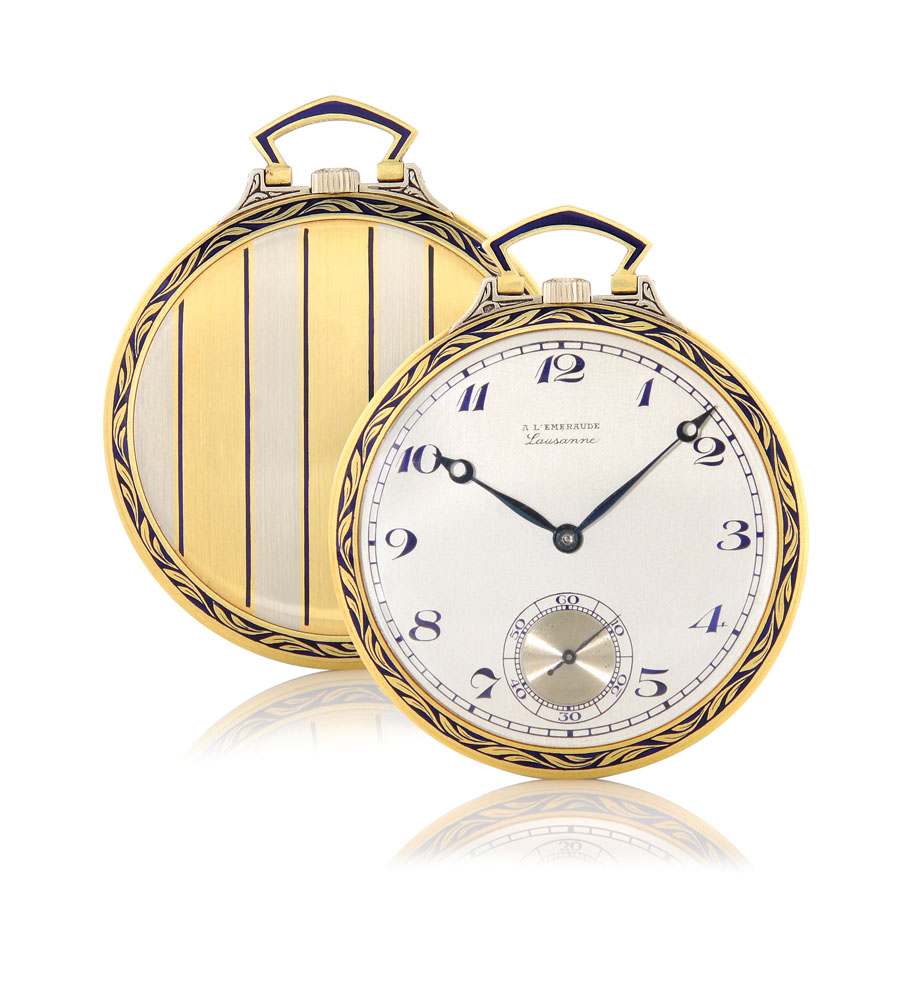 C. in oro giallo e bianco 18 kt con decori in smalto blu. Q. argentato con numeri arabi smaltati in blu e secondi al 6. M. n. 140074 piatto, rodiato con scappamento ad ancora, carica manuale. Quadrante firmato, cassa e movimento numerati.