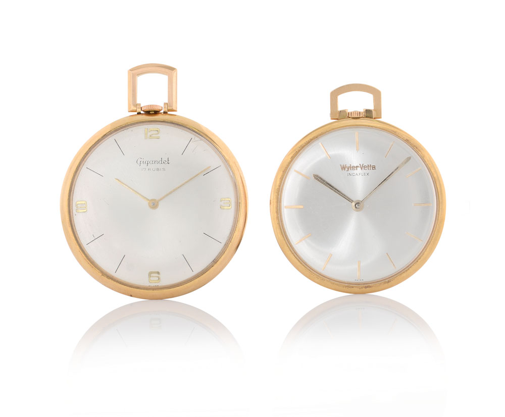 C. in oro rosa 18 kt. Q. argentati, uno con indici applicati, uno con indici smaltati e numeri arabi applicati. M. a carica manuale. Wyler Vetta quadrante, cassa e movimento firmati, Gigandet quadrante firmato.