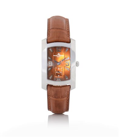C. n. 3252226 rettangolare in acciaio con fondello chiuso da viti e vetro zaffiro. Q. marrone con indici e numeri arabi applicati, secondi al 6. M. al quarzo. Quadrante, cassa e movimento firmati. Completo di cinturino e fibbia deployante in acciaio originali.