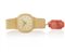 C. carrè galbè in oro giallo 18 kt. Q. champagne con indici applicati. M. a carica manuale. Bracciale a tessuto in oro giallo 18 kt. Quadrante, cassa, movimento e bracciale firmati.