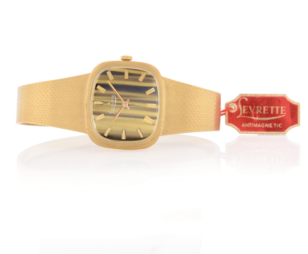 C. carrè galbè in oro giallo 18 kt. Q. occhio di tigre con indici applicati. M. a carica manuale. Bracciale integrato a tessuto in oro giallo 18 kt. Quadrante, cassa, movimento e bracciale firmati.