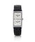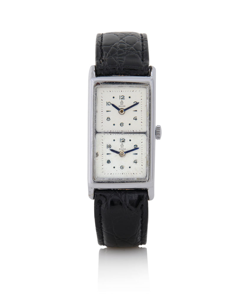 C. rettangolare in acciaio. Q. due quadranti argentati con indici e numeri arabi applicati. M. di forma a carica manuale. Quadranti firmati Solga.