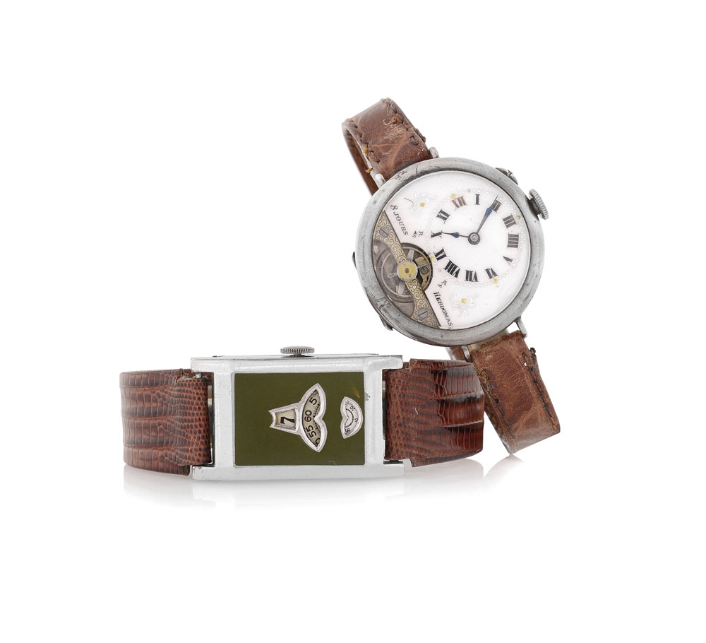 1. C. in argento con fondello a cerniera ed anse a filo fisse. Q. in smalto decentrato con numeri romani, bilanciere a vista con ponte inciso. M. a carica manuale (8 giorni). Quadrante firmato. 2. C. rettangolare in metallo con fondello a cerniera e fronte smaltato, aperture per ore, minuti e secondi saltanti. M. di forma a carica manuale.