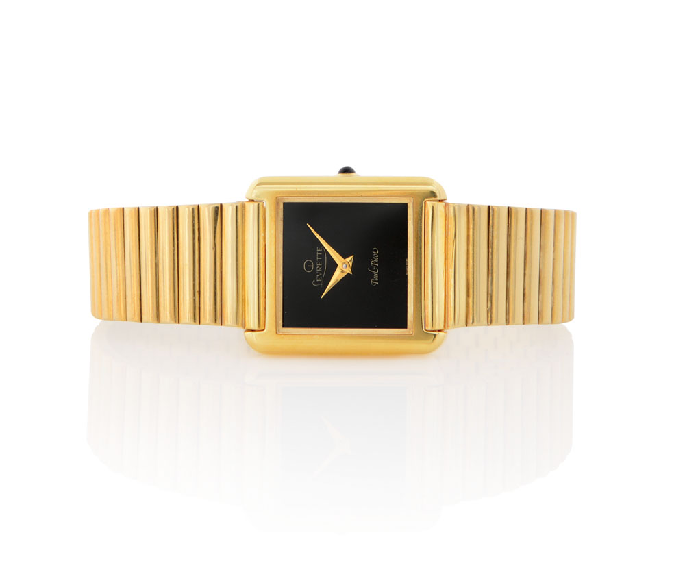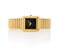C. rettangolare in oro giallo 18 kt. Q. nero. M. a carica manuale. Bracciale in oro giallo 18 kt. Quadrante, cassa, movimento e bracciale firmati.